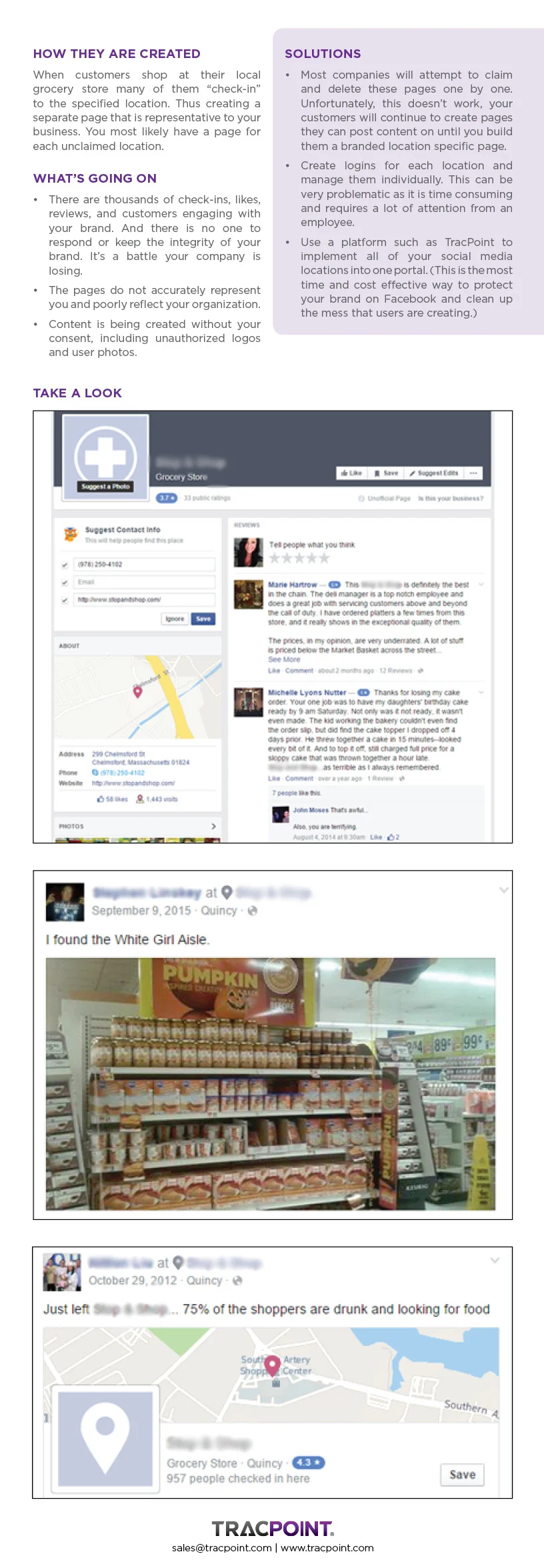 The biggest flaw that retail grocers make on social media is managing one Facebook page for their entire grocery chain. Although you have plenty of customer engagement on your page, truth is it’s not your only page. You most likely have a user created page for each of your locations. Unclaimed, unbranded, and uncensored. Filled with reviews, check-ins, profanity, and brand slanderers. It’s a reality many grocers are unaware of, but it’s one that needs to be addressed.
